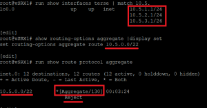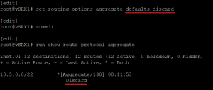 Upon inspecting the control on the device where the aggregation operation is performed, we can observe that the relevant route protocol is “aggregate,” with a default preference value of 130 and a reject type.