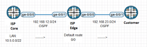 For instance, in the above topology, the ISP Core device is announcing the 10.5.0.0/22 network to the ISP Edge device. On the ISP Edge device, we could instruct it to generate a default route (0/0) and announce it to the Customer router if it possesses the 10.5.0/22 network.