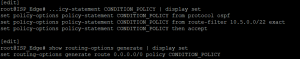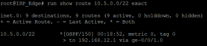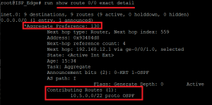 The ISP_Edge device is engaged in OSPF communication with the ISP_Core device, and it can learn the 10.5.0.0/22 network via OSPF. The condition policy has been crafted based on this scenario, and to associate the generate route with this condition, the policy has been linked to this route. Now, let’s check whether this route has been created.