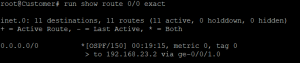 Yes, contributing routes are available, and the 0/0 route has been created. However, as previously mentioned, it appears as an aggregate route with the protocol type set to “aggregate,” despite defining it as a generate route. Now, let’s check whether this route has arrived on the Customer device.
